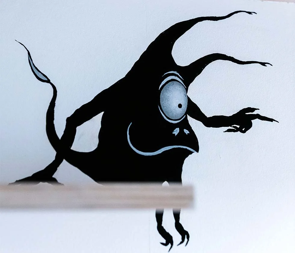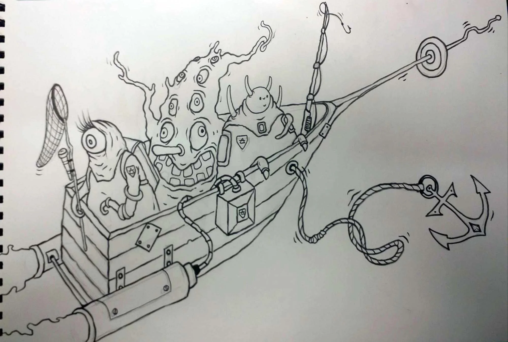 A fantasy punk space boat with 3 explorers are spotted by cute one-eyed aliens in their habitat - the imagined space.